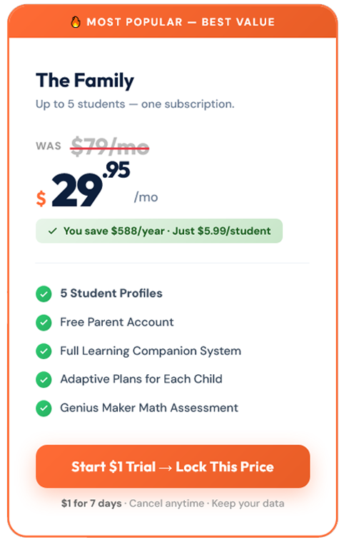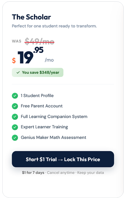 Your child’s grades will improve by at least one full letter grade in 30 days—or your money back, no questions asked. No tutor makes this promise. And that’s just the beginning: reduced stress, fewer homework battles, and continuous improvement that builds over time.